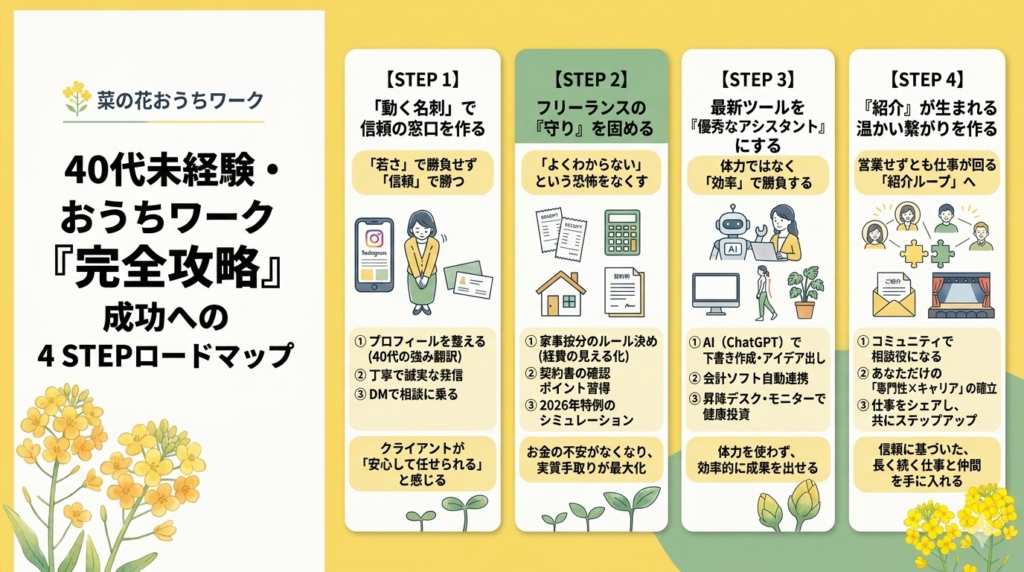 この記事では、40代未経験の方が迷わず、最短距離で自分らしい働き方を手に入れるための「4 STEP成功ロードマップ」を徹底解説します。